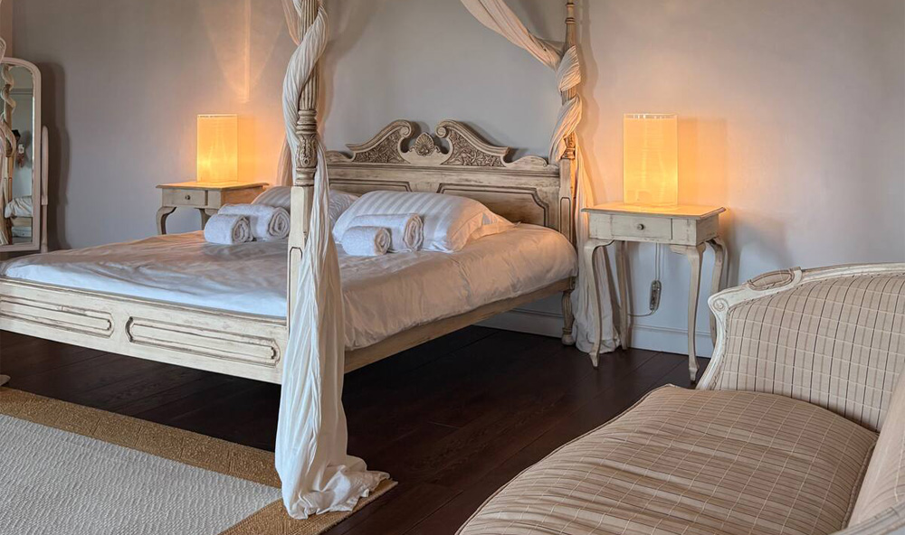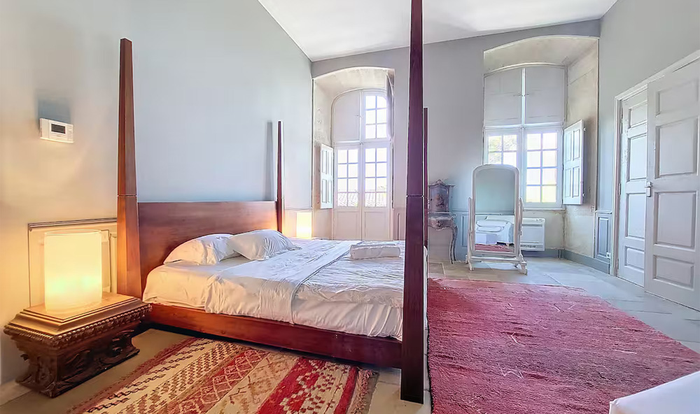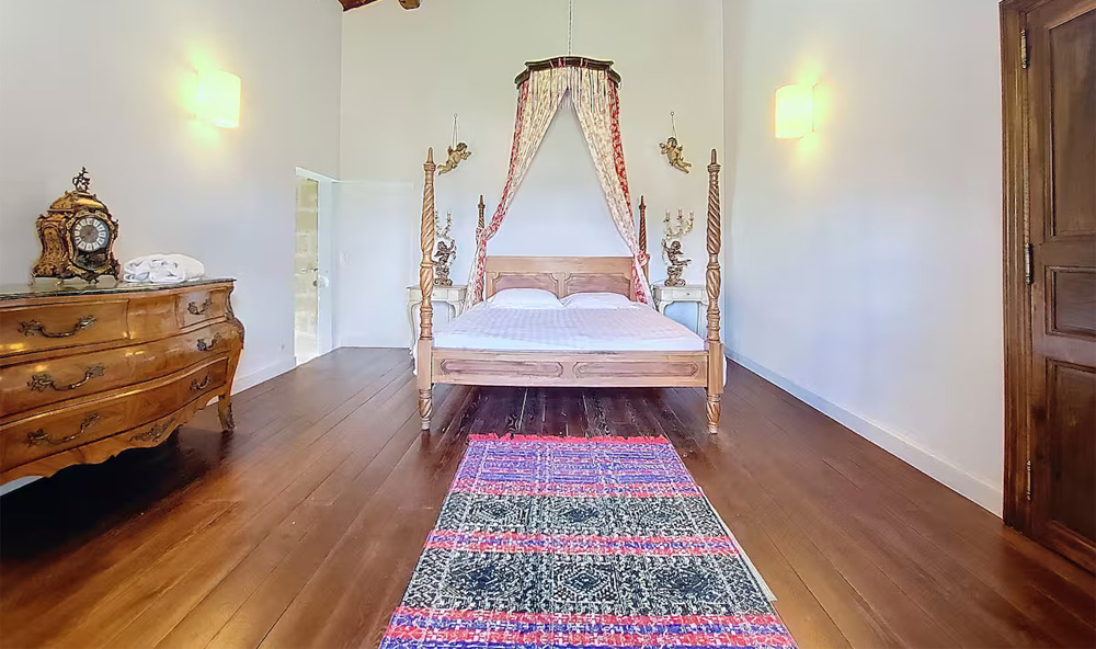 Also called La Chambre des Anges, this double bedroom offers panoramic views across the village and hanging garden. Adorned with a magnificent canopy bed delicately surrounded by sculpted cherubs, it breathes the charm of yesteryear. A neighbouring salon, equipped with a monumental stone fireplace, comfortable twin sofas and mobile AC invites slow, tranquil evenings.
