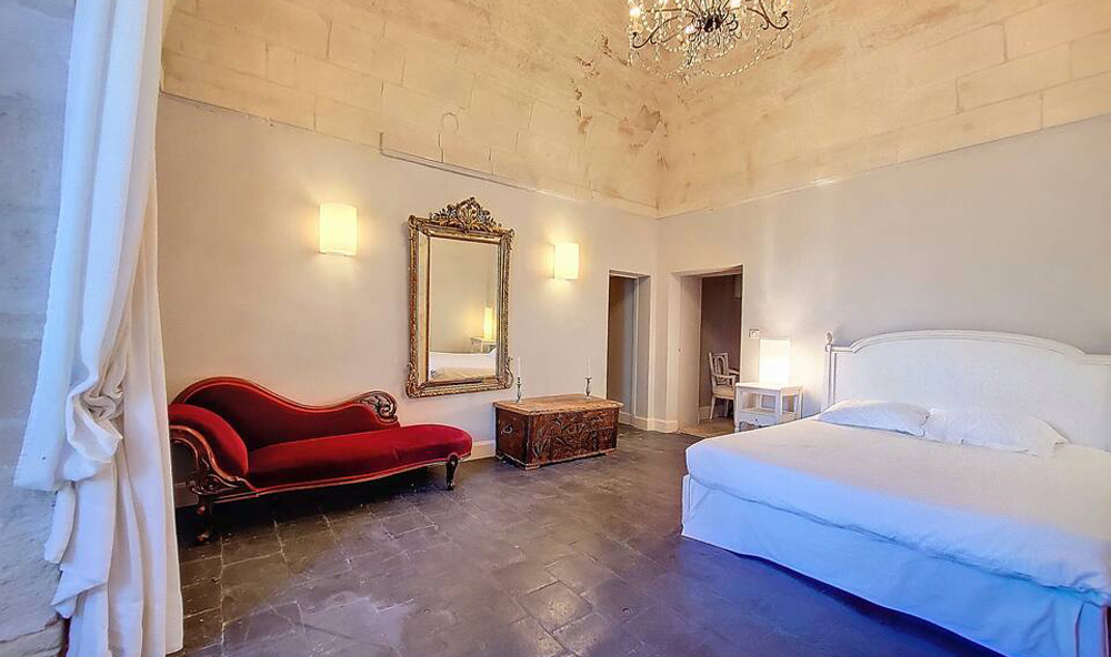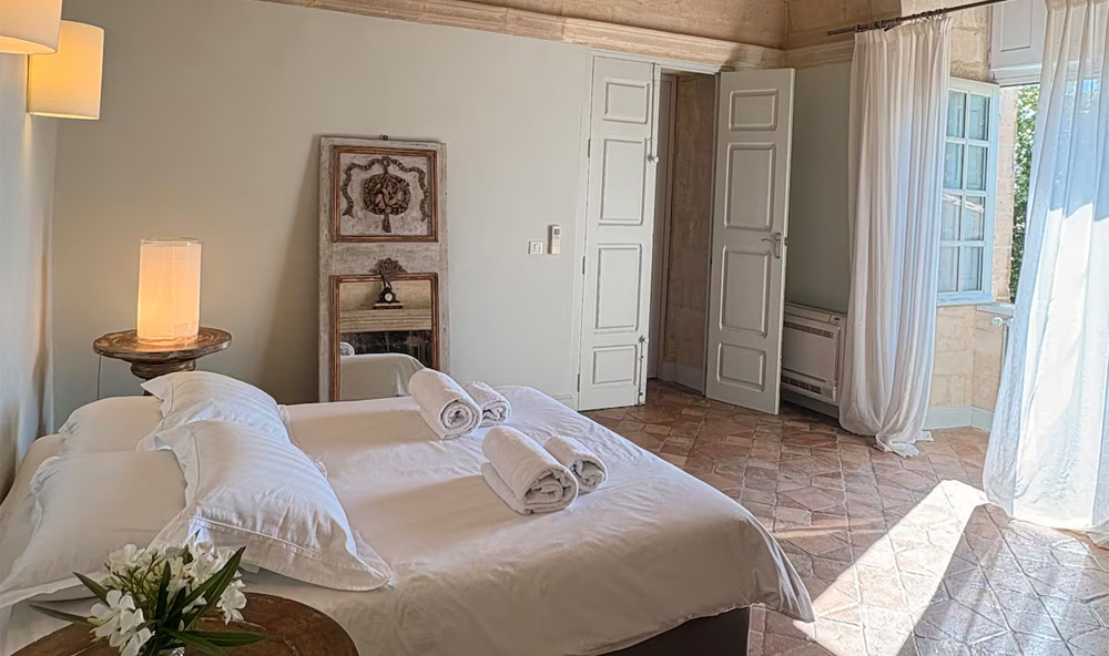 High 17-century ceilings, rugged stonework and a glittering chandelier exude the refined elegance and grandeur typical of the 17th century, while a discreet en-suite keeps modern luxury close at hand. An intimate slice of château grandeur.